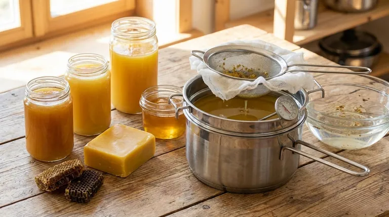 - Layer cheesecloth or a fine mesh sieve over your melting container to catch debris.