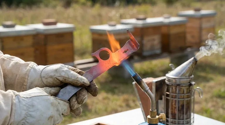 - How: Use a propane torch to heat the entire surface of the hive tool until it's too hot to touch. Alternatively, place it in the hot fire pot of your smoker for at least 30 seconds.