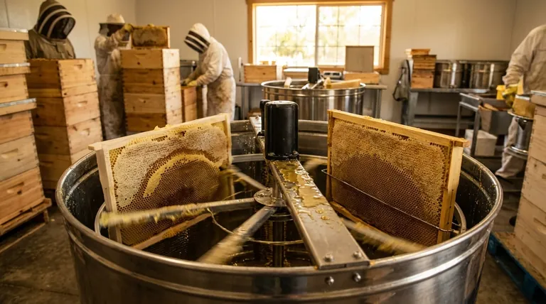 A honey extractor works by using centrifugal force. As the drum spins, it slings the heavy, viscous honey outward, away from the comb. The frame's one and only job at this moment is to serve as a rigid backbone, holding the delicate wax comb together against this powerful force.