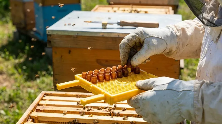 A special box with removable plastic cell cups is placed in the breeder hive. The queen is confined to this box and lays her eggs directly into the cups. The beekeeper can then remove these cups—egg and all—without ever touching the larvae.